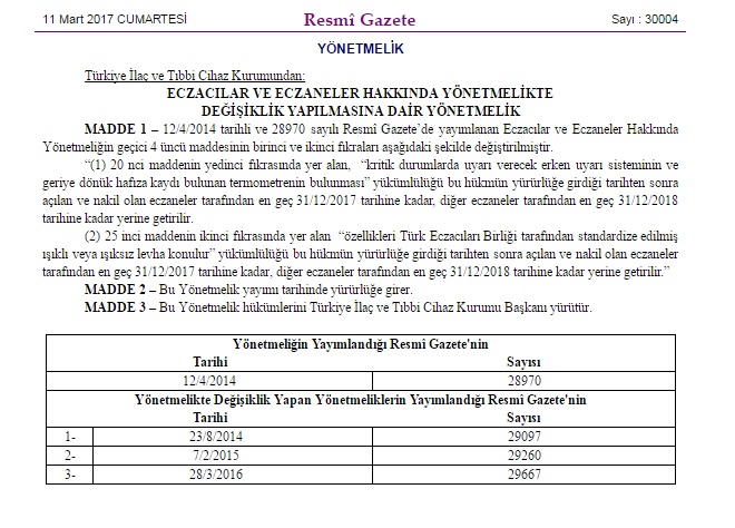 11 Mart 2017 tarih ve 30004 sayılı Resmi Gazete’de “Eczacılar ve Eczaneler Hakkında Yönetmelikte” değişiklik yapılmasına dair yönetmelik yayımlanmıştı.